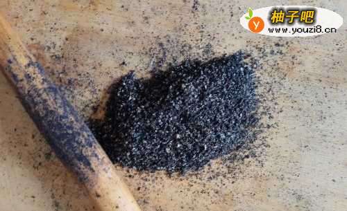 3将黑芝麻炒熟后,放在切菜板上,用擀面杖擀一擀,擀成稍碎一点即可,放在盛韭菜的盆中。