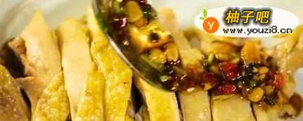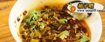 44、准备碗,放入蒜蓉、朝天椒、葱及花生碎,淋上热油,加入花椒油、生抽、蚝油、麻油、醋、香菜及盐,拌匀
