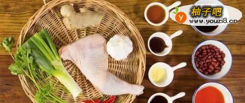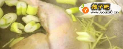 33、准备汤锅,加入水,将大葱、姜及鸭腿放入锅内,焖煮20-25分钟,取出切件,上盆