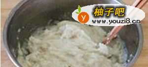 3把糯米粉倒入盆中,逐渐慢慢加水搅拌,揉成糯米面团。