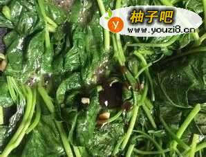 8菜叶子有点软的时候倒入一勺蚝油,适量盐,不用加水,因为一会番薯叶会炒出水,所以烧开后即可装盘。