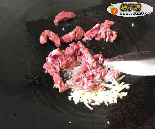 5锅烧热,放入油,蒜米,姜丝,加入切好的猪腰花。翻炒至猪腰变色,这时倒入苦瓜,加适量的盐,几滴酱油,翻炒均匀