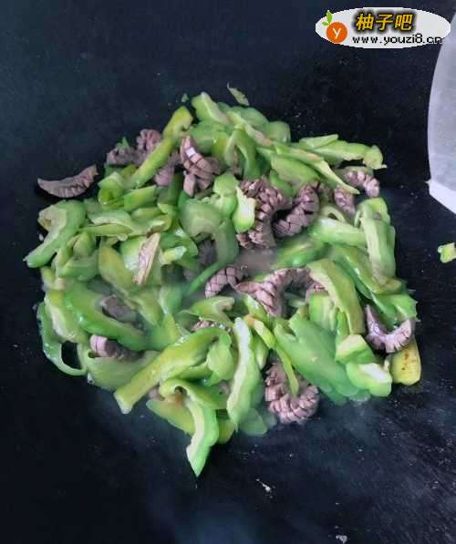 6顺着锅边加入小半碗水,盖锅盖,煮熟即可。关火上盘。美味的苦瓜炒猪腰花就完成了。赶紧试试好不好吃吧!