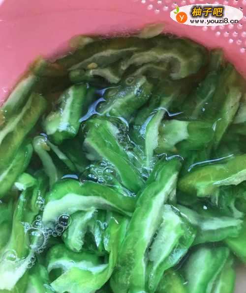 4把腌好的苦瓜泡进水里再洗洗,然后捞出,这样苦味就去掉不部分了哦!