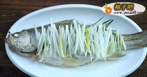 4鱼蒸好后,把盘子中的汤汁倒掉,姜丝全部拿掉不要,重新码上葱丝。