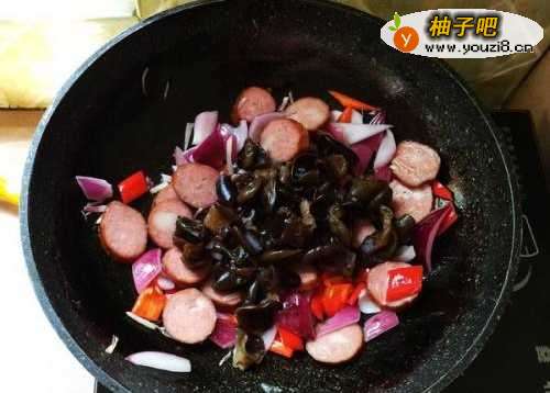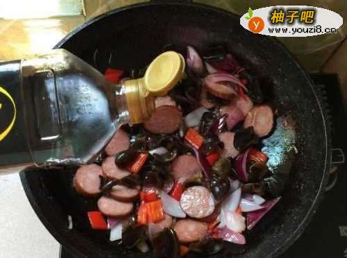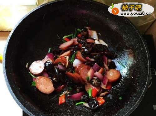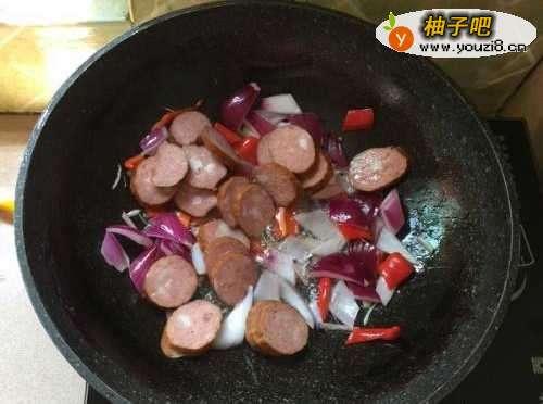 4第四步,下入红肠接着翻炒。