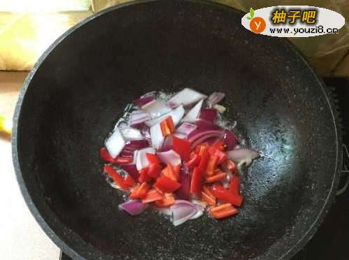 3第三步,炒锅中倒油,下姜丝炝出香味,然后下切好的辣椒椒和洋葱,快速翻炒2-3分钟。