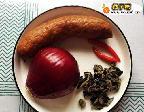 第一步。准备食材。黑木耳泡发开。洋葱,生姜和小葱处理下,辣椒切成圈,红肠切成片。