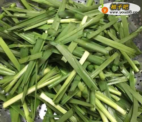 2韭菜摘干净、切段洗净备用。