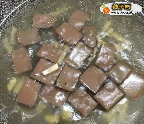 猪红切开成小块,然后焯水去腥,捞出备用。