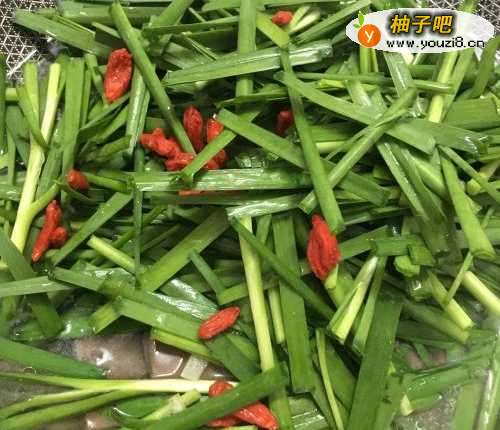 7再加入韭菜和枸杞,大火煮3分钟。