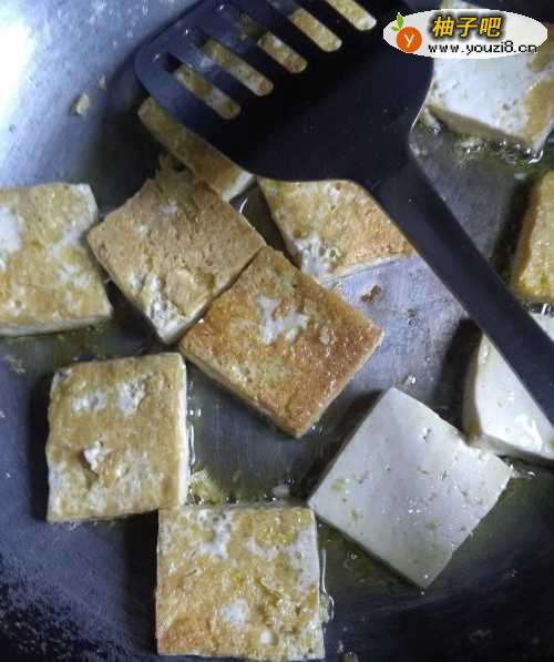 3锅中加入适量植物油,把切好的豆腐下锅煎,一面煎成金黄色后再翻另一面再煎。然后盛入碗里备用