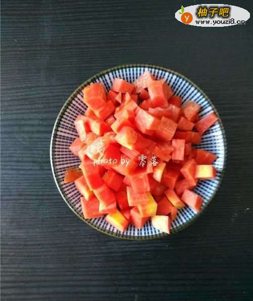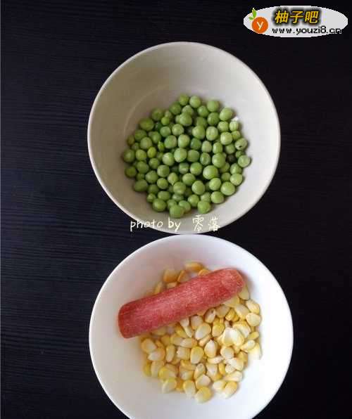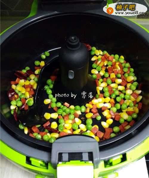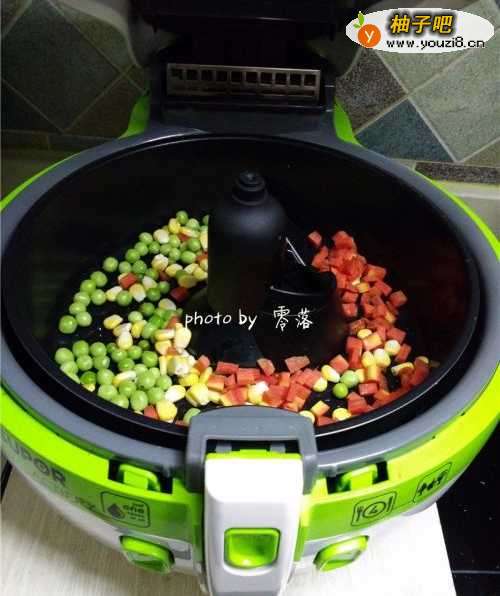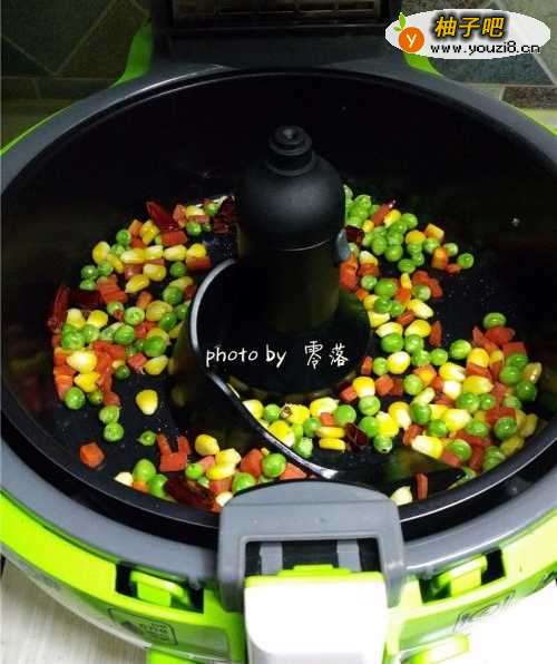 5放入玉米、豌豆、胡萝卜丁;合上盖子,接通电源,时间设置为3分钟;