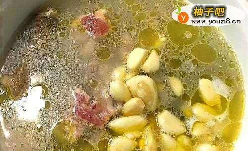 3放入蒜和鸡腿肉,中小火煮沸后续煮约5分钟。