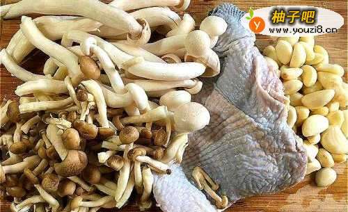 蒜去皮、鸡腿切小块、白玉菇和其他菌菇冲洗一下。