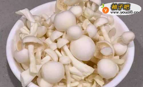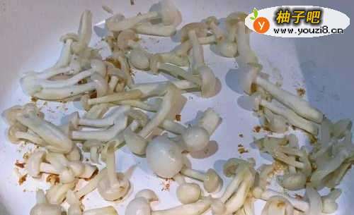 5鸡腿肉静置的时间,用锅中的鸡油炒白玉菇