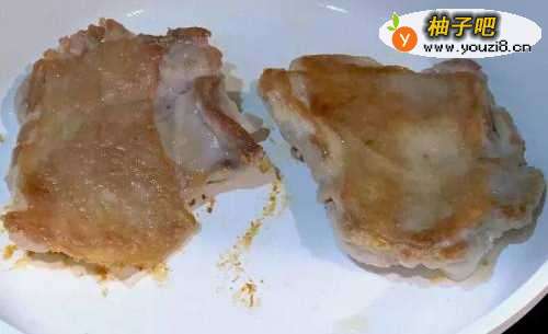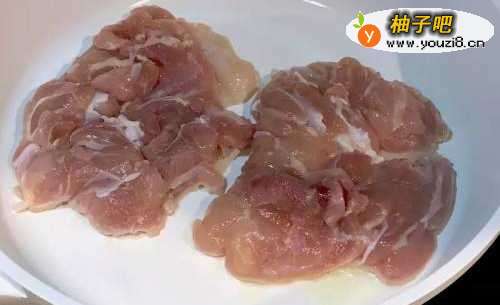 3锅中不加油,加热后以鸡皮朝下的方式放入鸡腿肉粒匠,中火煎1分钟,后转小火煎5-6分钟,煎至表皮金黄酥脆