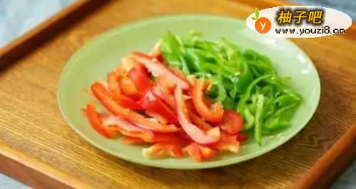 22、腌制的时候也别闲着,把红色灯笼椒以及尖椒斜切成丝。尖椒微辣,喜欢吃更辣的可以选择螺丝椒。