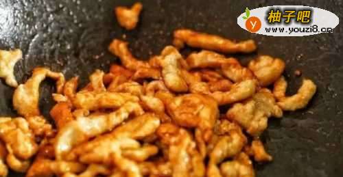 44、肉丝变白后,下入半勺盐、1勺生抽、1勺老抽来继续翻炒,让肉丝更加入味。