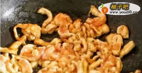 33、锅内放一勺植物油,下入十三香炝锅,下入腌制好的鸡胸肉丝翻炒变白断生。喜欢吃葱花炝锅的这里可以放点葱花。