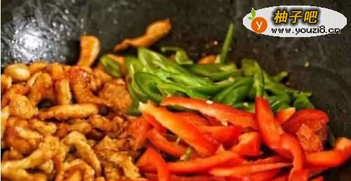 55、把炒好的肉丝滑到锅的一边,另外一边下入青红椒丝。先不要打乱。