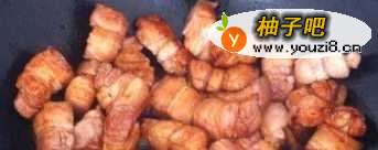3第三步,起锅烧油,油热后放冰糖超出糖色,放五花肉翻炒均匀