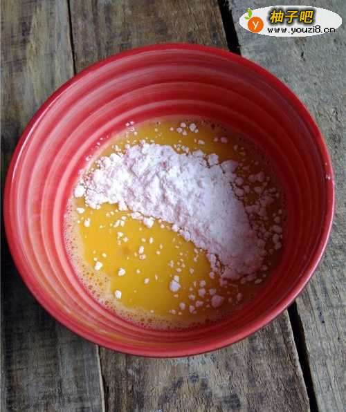 3蛋液里倒入面粉。
