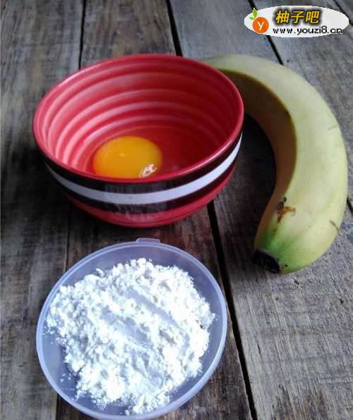 备好香蕉,面粉,鸡蛋;鸡蛋磕进碗里。