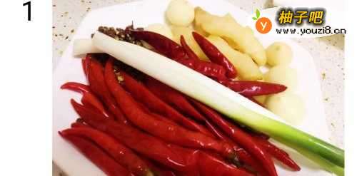 牛蛙市场宰杀后拿回家,洗净后剁成小块,加入料酒、适量盐、淀粉和少量白胡椒粉拌匀,研制十分钟左右。然后准备好配料材料:红色泡椒、干辣椒、泡姜、大蒜、大葱、干辣椒。