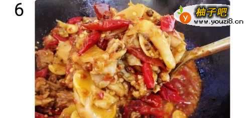 5放入腌制好的牛蛙肉翻炒两分钟,加入适量老抽,加入一碗水大火煮五分钟以上。