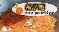 3步骤3、炒肉丝,炒饭肉丝成金黄色,倒入胡萝卜丝,炒胡萝卜丝要炒至胡萝卜变软即可关掉火。