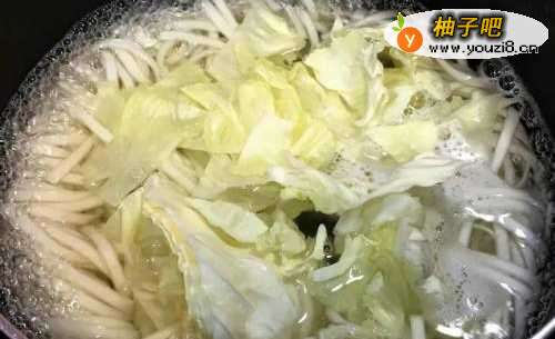 4面条与包心菜起锅后与酱料拌匀,再撒上葱花