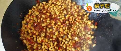 4倒入切碎的辣椒,炒两分钟。然后加入煮好的黄豆。