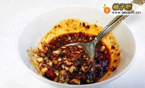 3酱油、乌醋、糖、麻油搅拌均匀后加入蒜末、辣椒末
