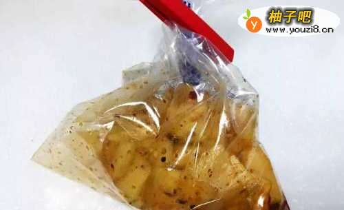 5把袋口封好,稍微摇晃一下大头菜,让酱汁可以均匀地沾在大头菜上
