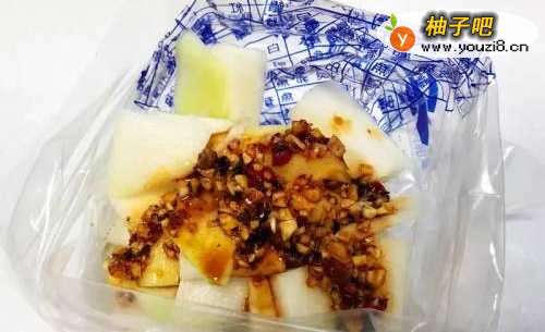 4腌好的大头水会出水,把水倒掉后,用凉的饮用水冲一下大头菜,然后放在食物袋子里,倒入酱料