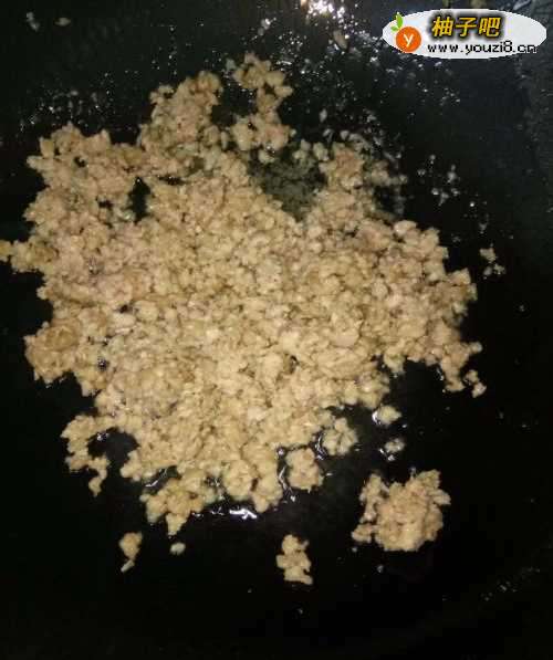 4下肉末入锅炒香、炒至肉色变白,盛出;