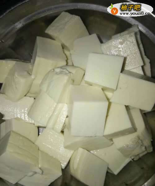 2将豆腐切成小块,放到水里煮开后捞出;