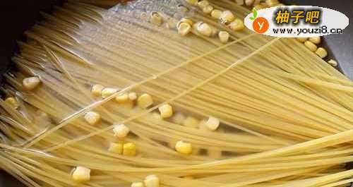 2倒入玉米粒,再将面条摊开放入水中,盖上锅盖,以中小火闷煮约7分钟。
