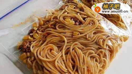 1.平底鍋中倒入水,蓋上鍋蓋煮滾。2.倒入玉米粒,再將麵條攤開放入水中,蓋上鍋蓋,以中小火悶煮約7分鐘。3.打開鍋蓋,加入肉醬及番茄醬,翻炒均勻。4.自製冷凍食品包:放涼後分裝至密封保鮮袋中,攤平後壓出空氣密封,再放入冷凍保存。5.食用前一天放冷藏退冰,隔天取出後將麵料倒入可微波容器中,微波加熱即可。