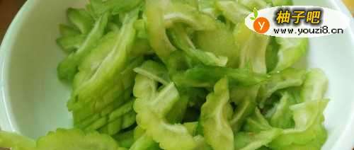 2将洗好的苦瓜。分两半去除内部籽部分后,切成小条长不过3cm厚不过0.5cm状‘湖南辣椒切好(如图所示),鸡蛋打入碗里调匀装盘备用。