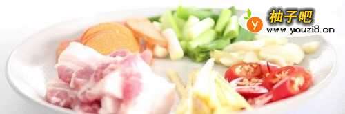 把生姜 胡萝卜 大蒜 五花肉切成片 把辣椒 青葱切成段