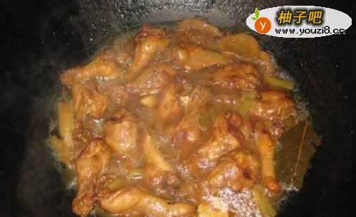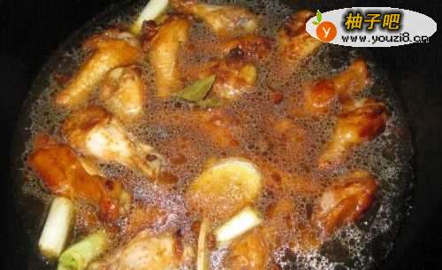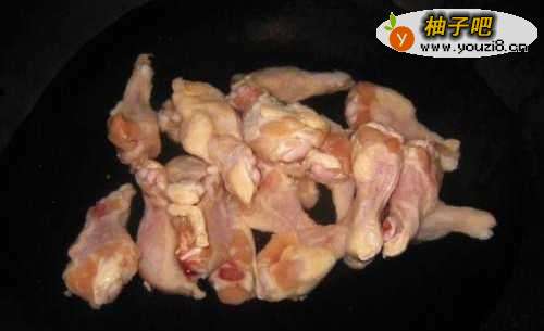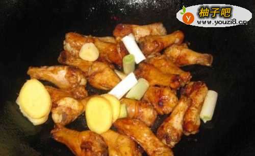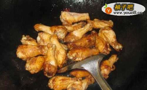 5倒入焯好的鸡翅根快速翻炒,使其上色均匀