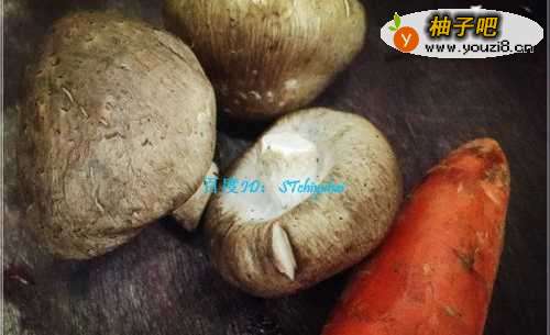准备主要的食材,主要是新鲜的香菇两三个、一根新鲜的胡萝卜,少许生姜、蒜头。