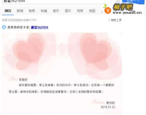 4把生成的密码发给亲爱的他/她,他/她收到后打开百度首页,把密码放到百度的框框里,百度一下就能看到你写的内容了。