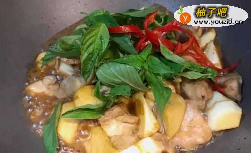 6开盖后转中大火,将酱汁收干至剩约1/2,起锅前加入九层塔和辣椒拌炒