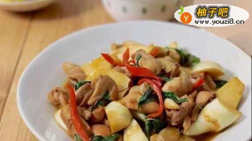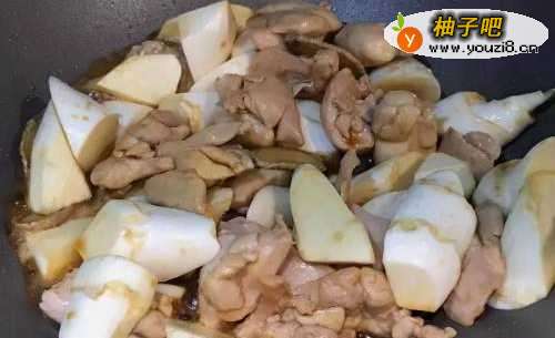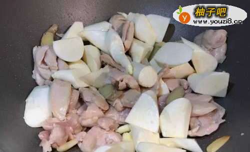 4鸡肉下锅后翻炒至表面变色,就可以加入茭白一同翻炒