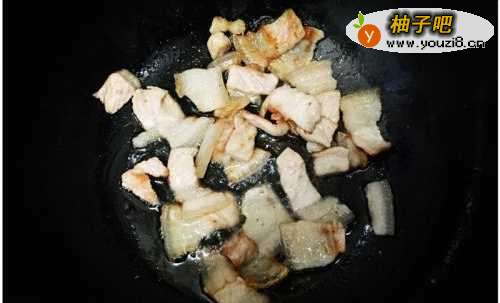 7榨猪油的过程要不时翻动猪肉片,不要让其粘锅,一边炸一阵后翻转至另一边,待肉片略微显黄色开始加入少许蒜末、生姜、辣椒干,翻炒一会,加入火腿片,加大火候快炒一会。