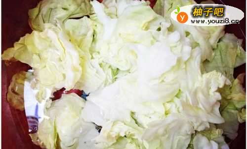 3将小片的包菜叶用清水洗净,反复清洗几次,然后捞出沥干备用。