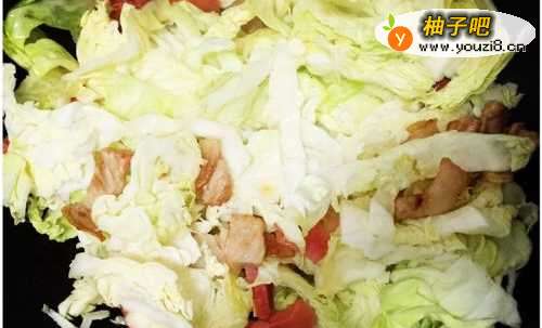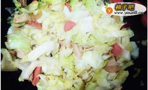 8开始加入沥干的包菜,加入少许热开水,开大火快炒,要快速翻动,尽量不要让火腿粘在锅底。